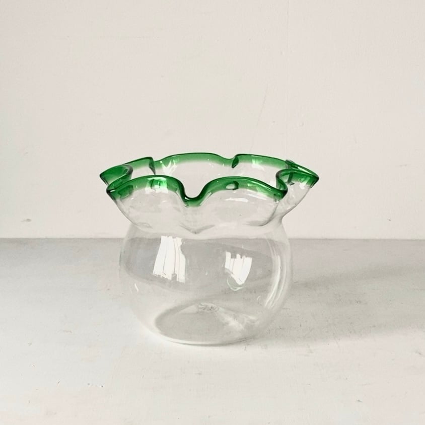 - 美術品・アンティーク・コレクション > 工芸品 > ヴィンテージ ビードロ 吹き硝子 フリル ガラス 三脚 金魚鉢 めだか鉢 気泡 ヴィンテージ ビードロ 吹き硝子 フリル ガラス 三脚 金魚鉢