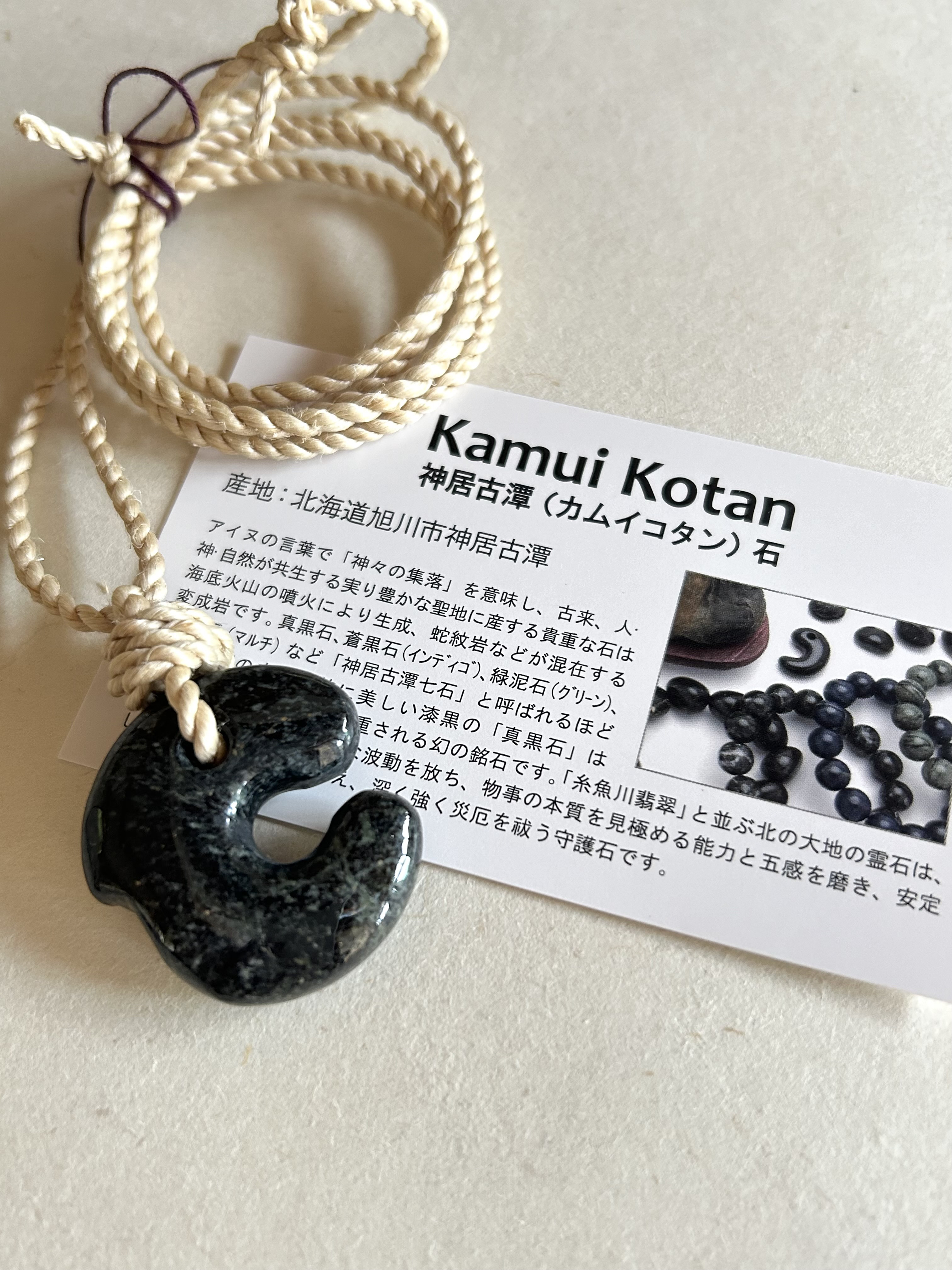 | 商品の特徴 | 【守護の石】神居古潭石『飛龍』☆ブラック☆ペンダントトップ 精麻より紐ネックレス。神居古潭石飛龍・1 30mm - ザ・ストーンズバザール。黒曜石 龍神ペンダント ー 三宝堂オンラインショップ。【神居古潭石 飛龍☆ペンダント精麻より紐ネックレス】☆保証書付☆在庫一点ご神事用精麻産地:栃木県より紐長さ:最大約82cmより紐太さ:約2〜2.5mm前後神居古潭石原産地:北海道旭川市サイズ:32X30X10mm重さ:約20g(より紐含む) *渋みのあるブラックに個性的な紋様が入った神居古潭石です。希少な石の為仕入れ先にも在庫が余りありません。現物を見て厳選したハイグレードの神居古潭です。適度に重さもあり、見応えのある高評のネックレスです。「糸魚川翡翠」と並び称される霊石「神居古潭(カムイコタン)石」は海底火山の噴火で玄武岩質の溶岩から生成された複雑な変成岩で、緑、藍、褐色、黒など多彩に発色、水墨画のような風情、美しい光沢、滑らかな岩肌という魅力に加え、宇宙の起源に通じる高い波動を放つ霊石です。カムイコタンとはアイヌの言葉で「神々の住まう集落」を意味し、現地からは縄文時代の竪穴式住居、ストーンサークルなどの遺跡が発見され、古代より人・神・自然が共生する実り豊かな聖地です。石言葉:物事の本質をとらえる能力と危機を察知し回避する直感力を磨き、災厄を祓う守護石。【勾玉「飛龍」】宇宙崇拝、輪廻転生、不老不死などを表す勾玉は、翡翠、瑪瑙、水晶、琥珀などで作られ、豊作祈願、武運長久、魔を除ける、狩猟などの安全、富貴福徳の象徴として崇敬されています。勾玉「飛龍」は、永遠の繁栄へ導く勾玉のエネルギーに加え、自然現象を意のままに操り、富と権力の象徴とされる「龍」の霊力を宿す守護石です。【精麻】古来より『麻には神が宿る』と考えられ、『邪氣払い、魔を除ける』効果や、『塩や水でも祓えないけがれを払う』と言われています。ご神事にも用いられ、『清め祓いと生命力の象徴』として神聖なものとされています。『人々の成長・発展・商売繁盛・子孫繁栄』などを意味し『縁起物』として私たちと深く繋がっています。*天然石ですので細かなカケや凹み、歪な部分やクラックなどがある場合があります。*出来る限り自然な色みになるよう撮影を心がけていますが、お使いのディスプレイ環境によって見え方が多少異なる場合がございます。予めご了承ください。*精麻は天然素材の為、一部色むらや表皮が残っている場合があります。一つ一つ丁寧にお作りしました。。守護の石】神居古潭石『飛龍』☆ブラック☆ペンダントトップ精麻。。珊瑚 k18 pt900 ペンダント。極上ブルー!ラリマーの天然石♪ マクラメ編みネックレス。龍眼天珠たん 災い取れる?。❤️la.ailana商品❤️。アコヤ真珠ベビーパール、シャンパンカラー、シトリンの、ネックレス、。アンダラクリスタル 14kgf原石 ペンダントトップ[sa3796]。レア♡ジェーンマープル Jane marple 天使 ハート ネックレス 時計。2種類の、白蝶真珠ケシパールと、あこや砂芥子パールの、オメガ風ネックレス。ニッキー様4点おまとめ。アコヤ真珠ラベンダーカラー、クレオパトラ、あこや極々小砂芥子パール、オメガ風。専用ページ アクセサリー3点。goro's ゴローズ ターコイズネックレス 直接購入品。『薄紫咲』パープルレピドライトとクンツァイトのマクラメペンダントネックレス。座敷童子ちゃん 虹龍神様と宇宙エネルギーネックレス。『蒼光』ラブラドライトとカイヤナイトのマクラメペンダントネックレス | ||