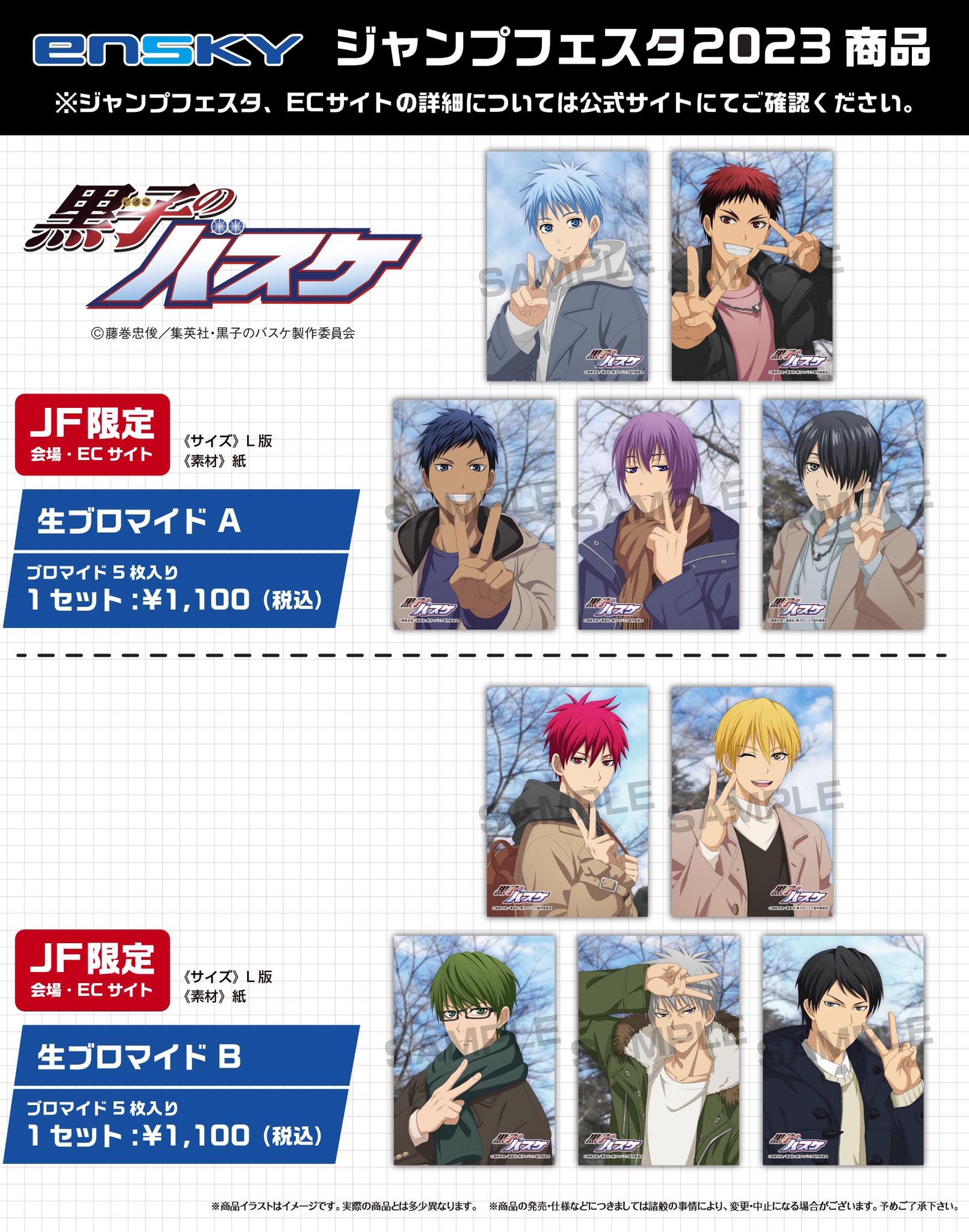 | 商品の特徴 | Fhqw0OjVEAA1LUI.jpg:large。エンスカイ:ジャンプフェスタ2025 エンスカイブースにて新規。黒子のバスケ JF2023限定 生ブロマイドA、B 黒子のバスケ JF2023。エンスカイ:ジャンプフェスタ2025 エンスカイブースにて新規。。ジャンプフェスタ2023限定 生ブロマイドA、B黒子のバスケ10枚セット | ||