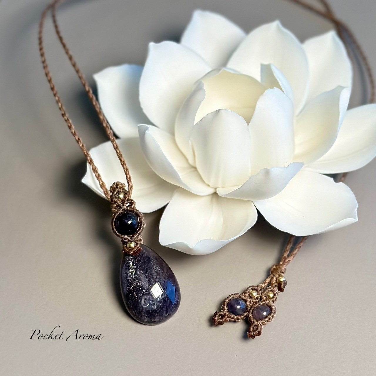 - アクセサリー > ネックレス・ペンダント > 『羅針盤』アイオライトサンストーンとアイオライトのマクラメペンダントネックレス 羅針盤』アイオライトサンストーンとアイオライトのマクラメ