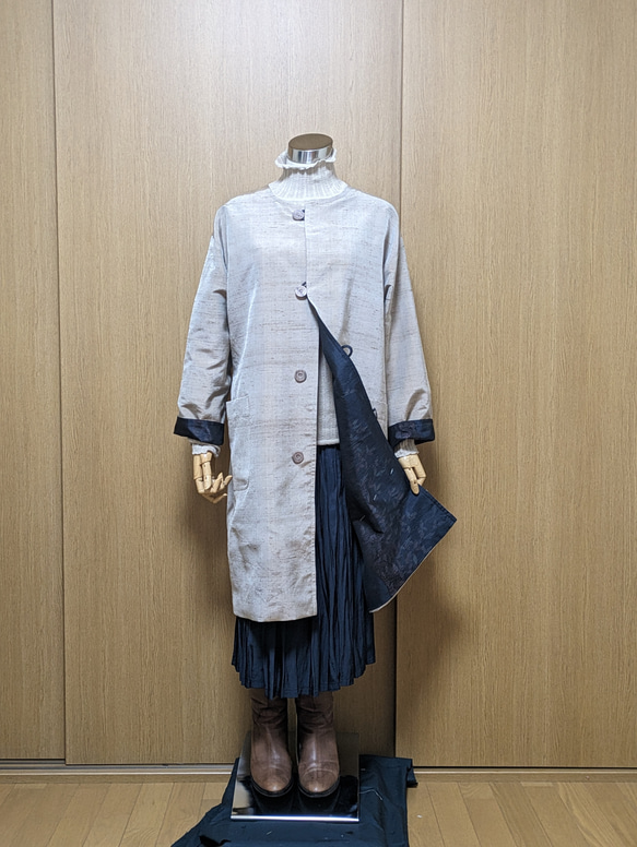| メーカー名 | 726850372 | ブランド名 | 着物リメイク 白大島紬×黒大島紬 リバーシブルコート 着物リメイク |